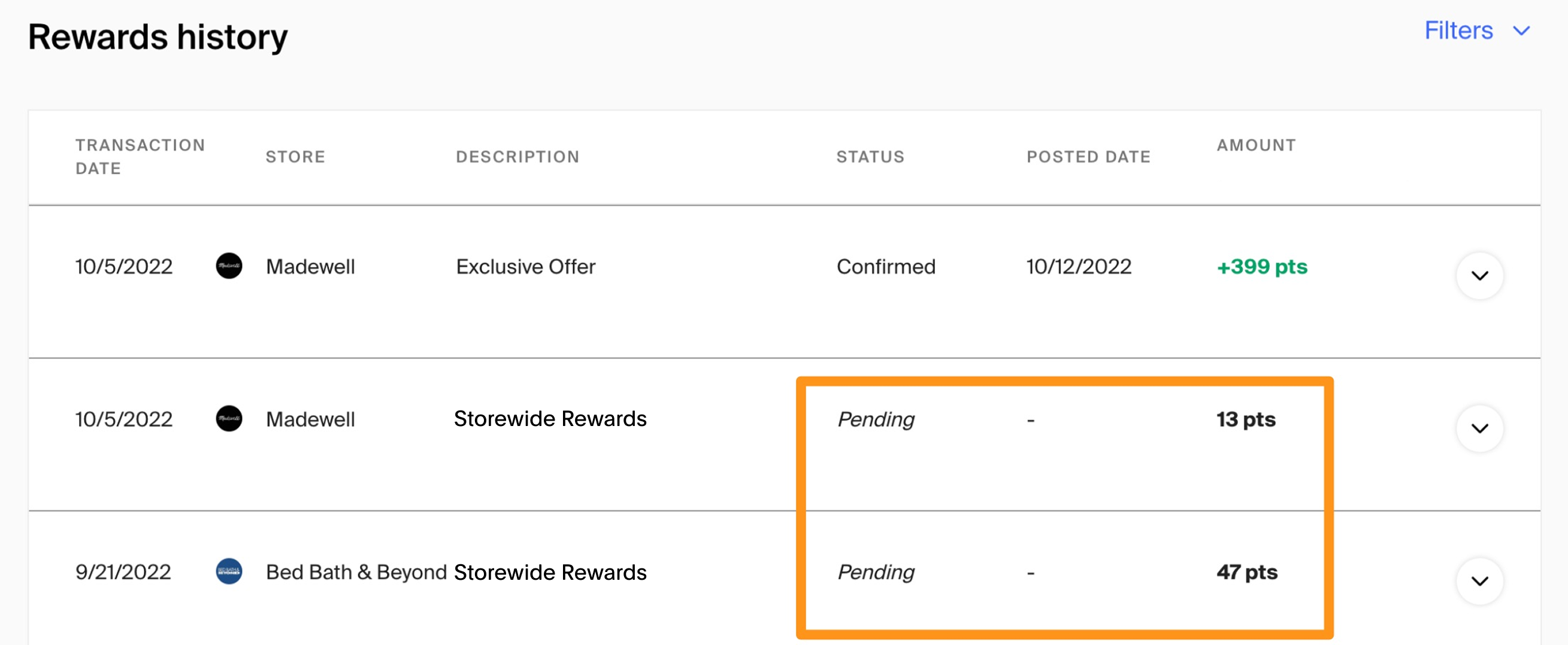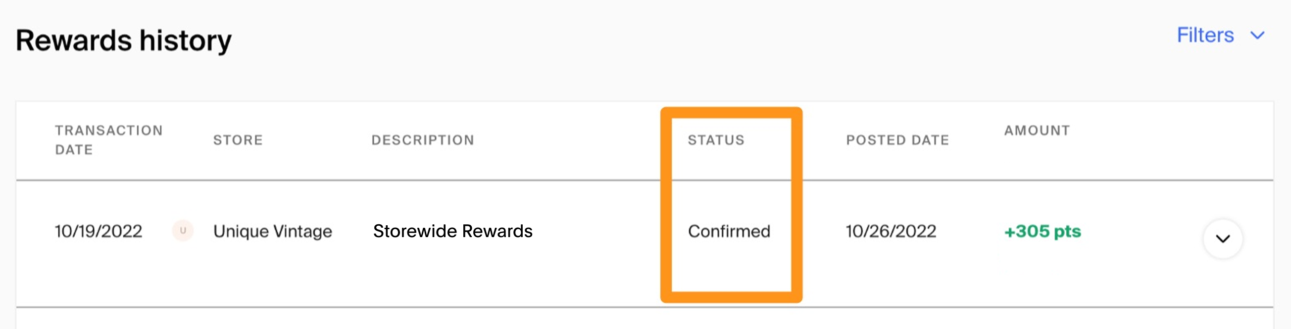 While points appear as pending, they cannot be used or redeemed. You’ll be able to see when your points are no longer pending and become available to redeem on your Activity page - they'll be listed as Confirmed under "Status."