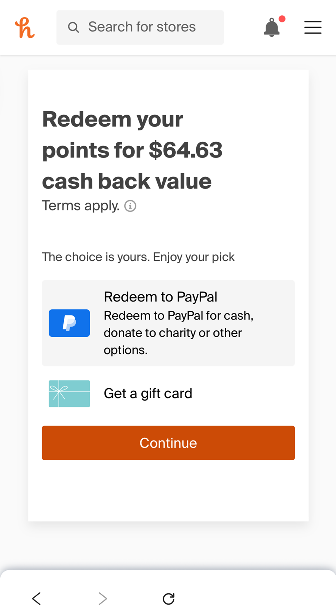 2. You'll be redirected to the Redemption Page on the Honey website within the in-app browser. Be sure you select your redemption option and click Continue.