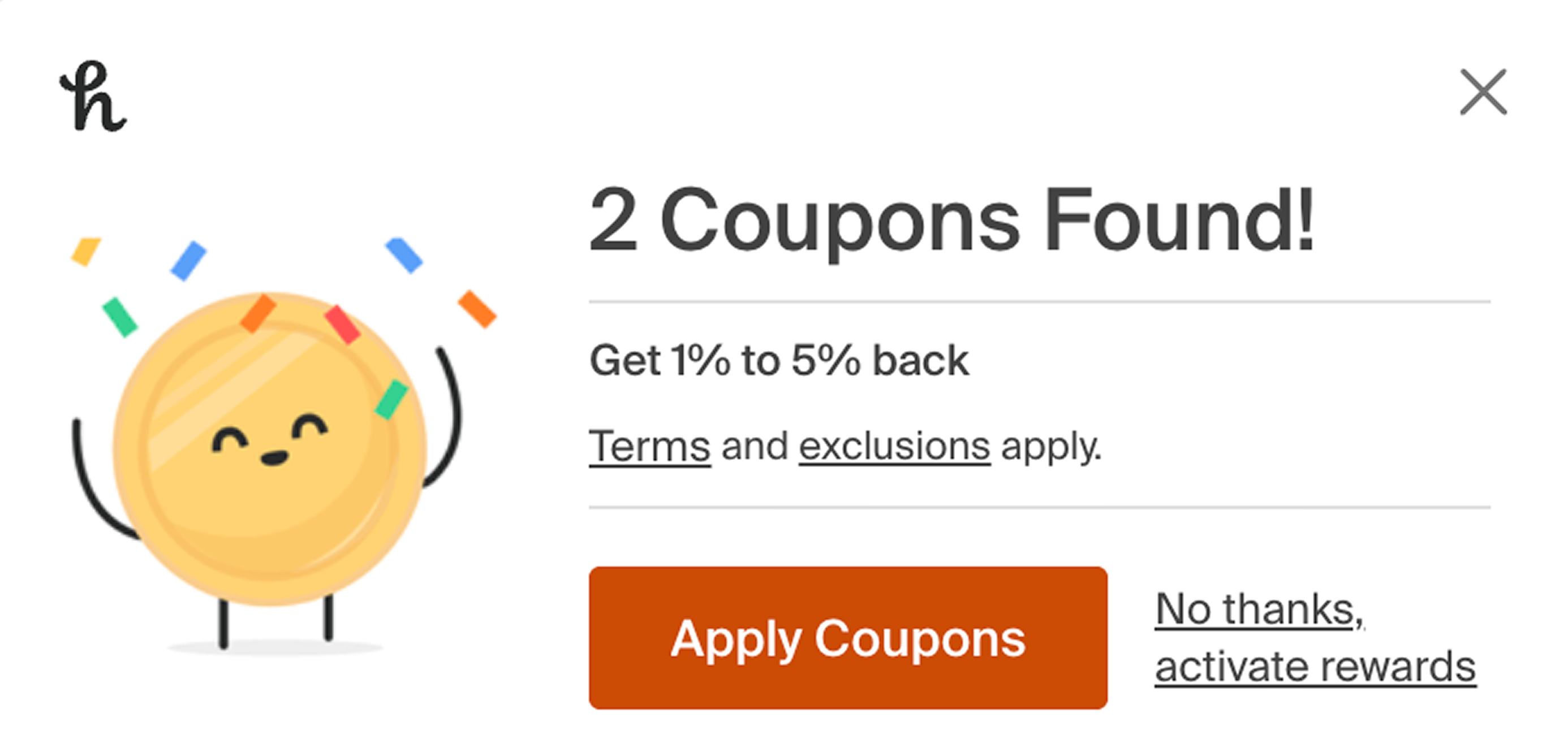 This window will also pop up automatically if we find coupons for that site. Just click Apply Coupons and we’ll test the available codes we found. If we find a working code for your order, we’ll apply the one with the biggest savings to your cart.