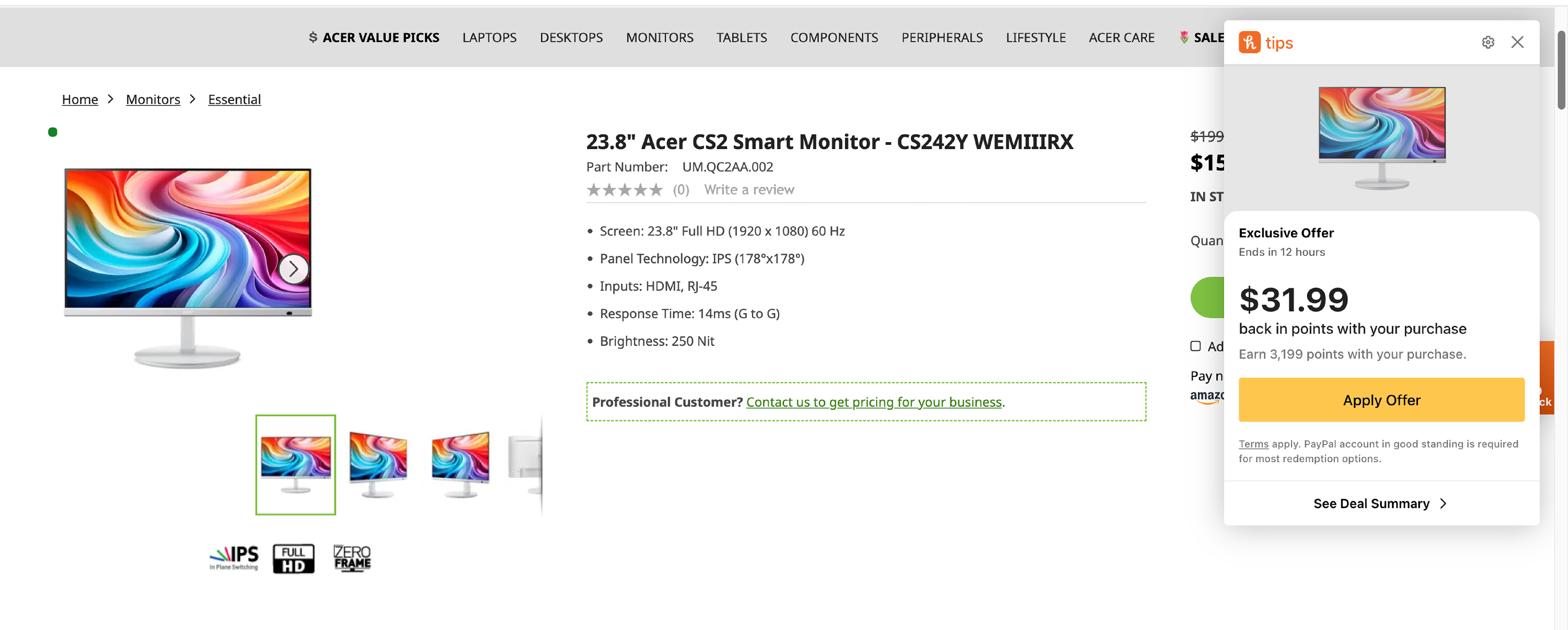 Exclusive Offers are item-specific opportunities to earn extra PayPal Rewards points while shopping using the Honey browser extension! If an Offer is available for an item, you’ll see Honey pop up while viewing the product page to notify you.